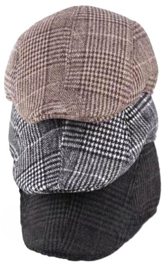 Polyester men's golf flat cap hat for sale online in plaid pattern colours grey, brown, beige, dark grey. Peaky Irish paddy newsboy beret for sports events, casual headwear. Also available in plain colours red, black, navy, grey.